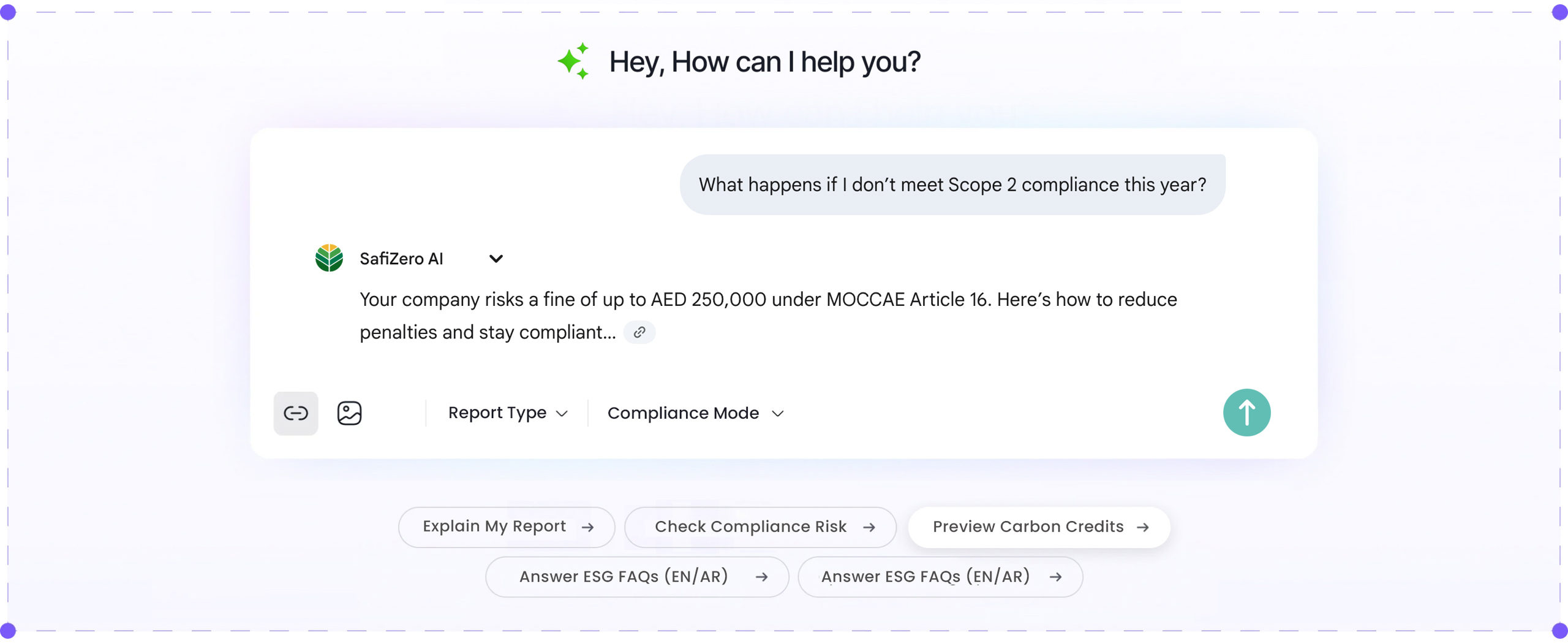 Simulate potential fines of AED 50K–2M under UAE law and forecast $500–$1,000/month in carbon credits. Make smarter decisions with clear financial insights.